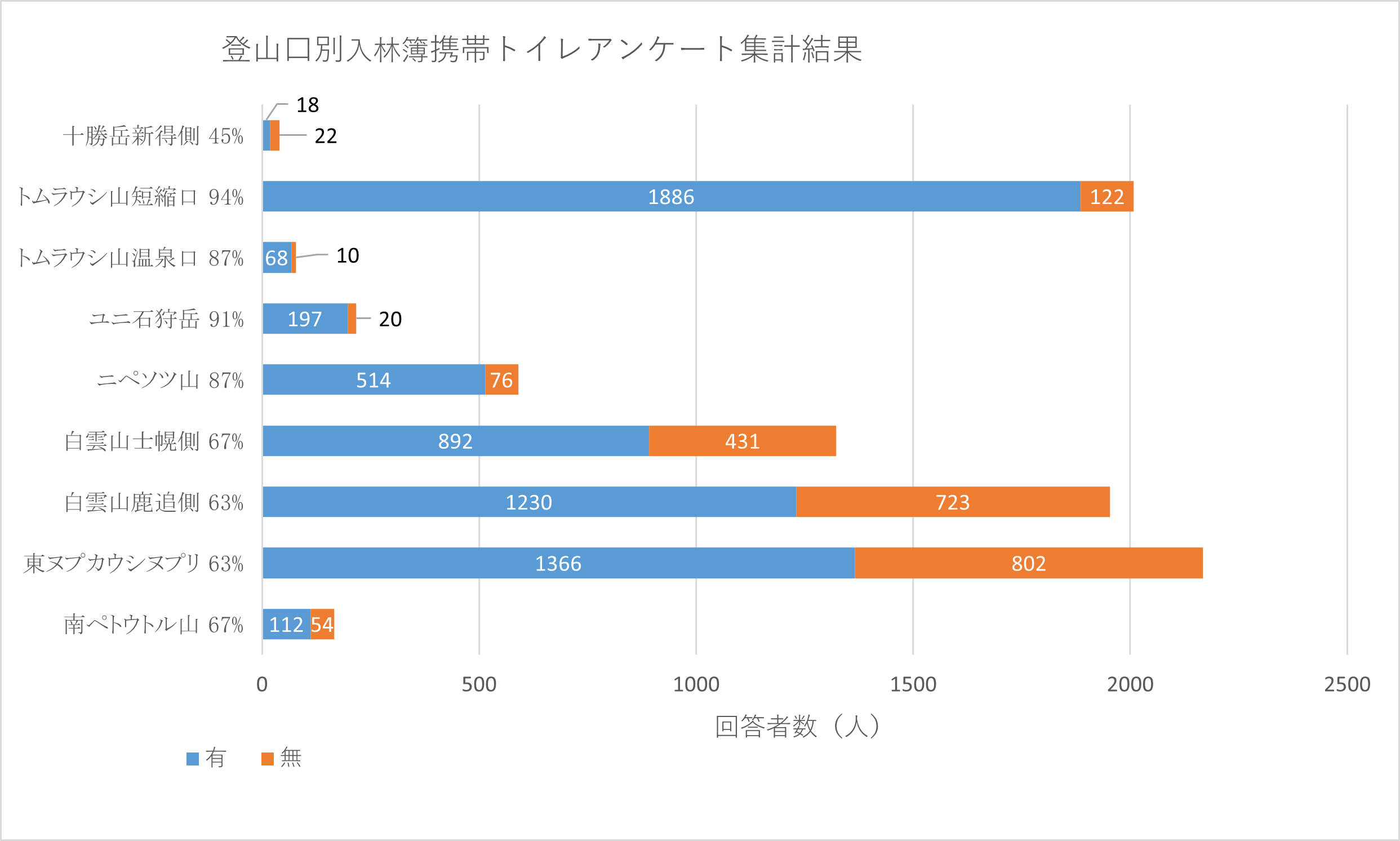 トムラウシ山やニペソツ山など登山時間の長い、あるいは、健脚向きの山で持参率が高いように見受けられます。登山のステップが上がる中で装備を整え、携帯トイレもその一つに加えられているのでしょう。