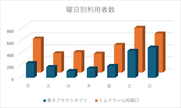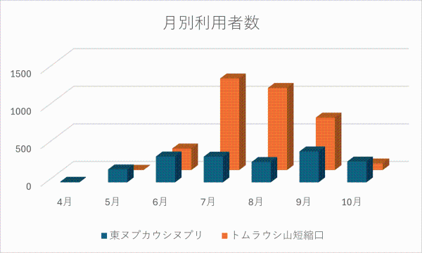 月別では、雪が残る5月や降雪が始まる10月にトムラウシ山は利用者が少なく、雪の少ない東ヌプカウシヌプリでは4月から10月まで幅広く利用者が訪れますが、夏の暑さが厳しい8月にはいくらか凹んでいるようです。