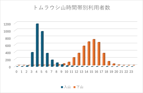 トムラウシ山では、長い登山時間を見越して日の出前後に入山される利用者も多く、4~5時にピークが見られますが、山中泊の利用者であろうゆっくり目の入山も見られます。12時ごろまでに下山されるのも山中泊の利用者でしょうか。登山時間に幅があるのでしょう、下山には入山ほどのピークが見られません。
