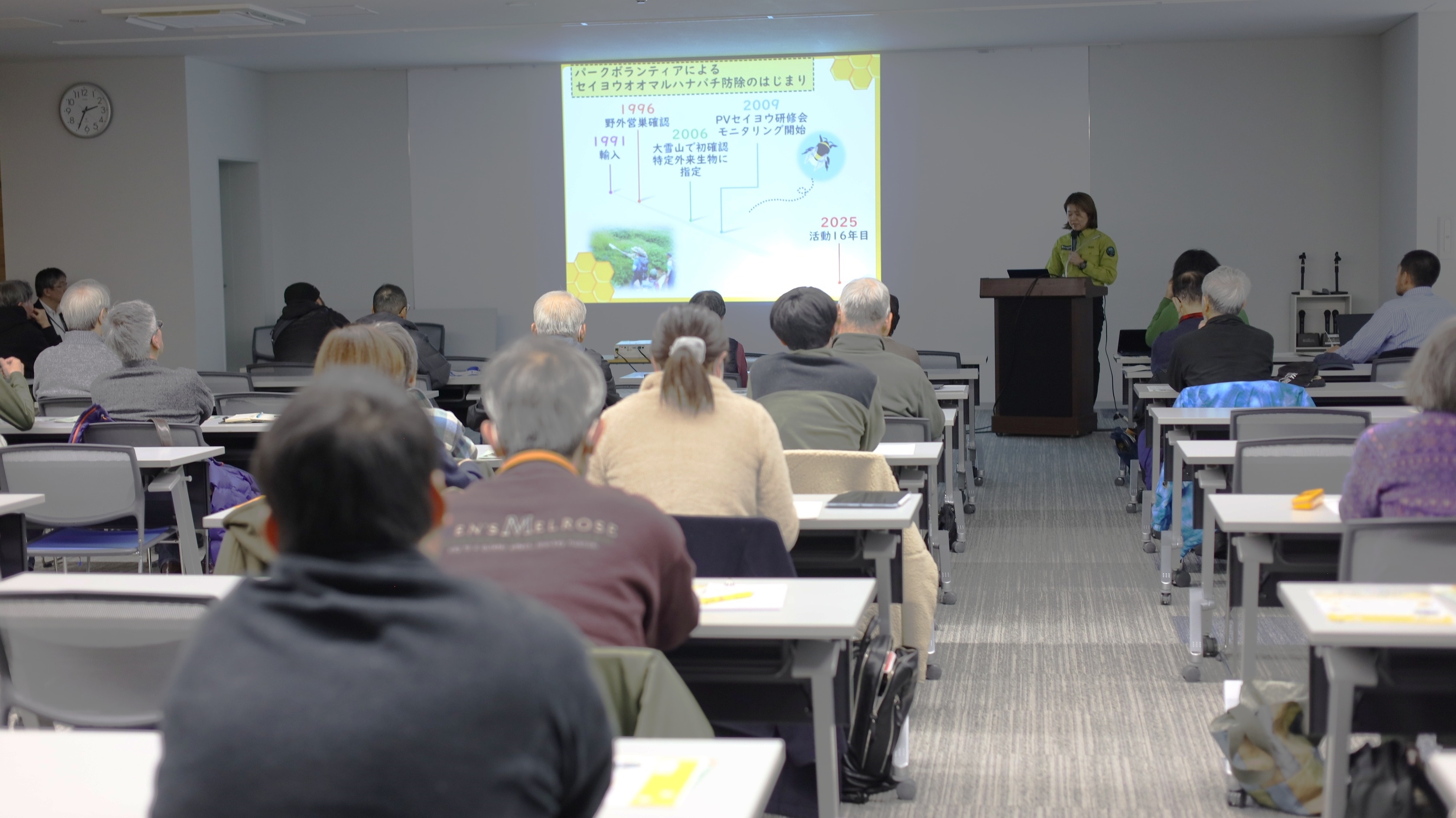 当日の発表では、環境省が定めている大雪山におけるセイヨウ防除の指針の概要や、大雪山の山岳地でパークボランティアの皆さんと16年間取り組んでいるモニタリングの報告、旭岳姿見の池周辺でセイヨウオオマルハナバチ(以下「セイヨウ」という。)の目撃数が多い理由やモニタリングの課題等を発表させていただきました。