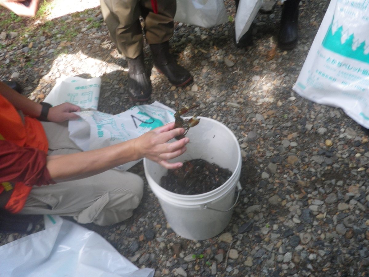我々事務局は捕獲されていくウチダザリガニをバケツに集約しつつ、