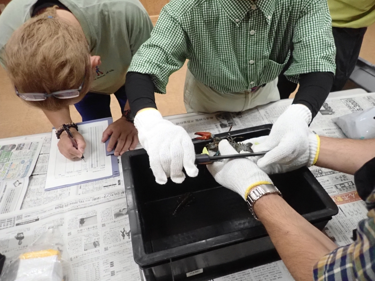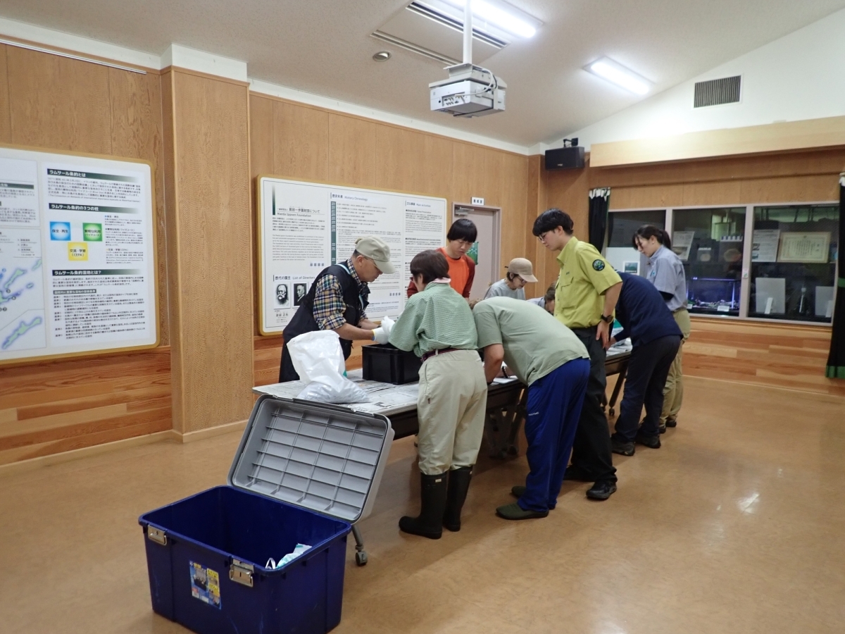 捕獲した全個体の雌雄判別や電子ノギスでの計測作業を行う。