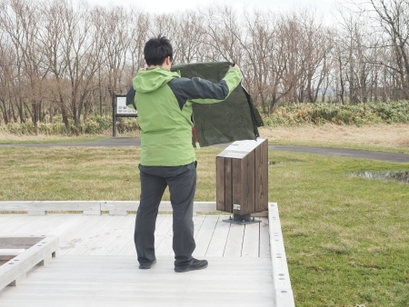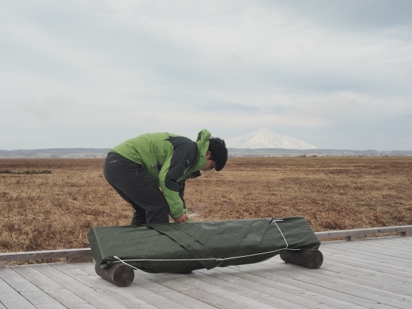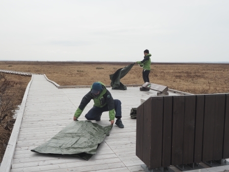 毎年、サロベツ地域では雪が降り積もる前に国立公園内の看板を風雪などによる劣化を少しでも防ぐためにブルーシートで囲んでいます。