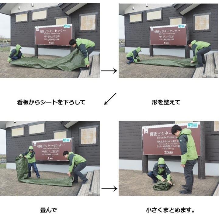 場所は変わって幌延ビジターセンター、ここには木道上の看板だけではなく大きな看板があり、一人では大変な作業となるため協力して外しました。