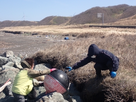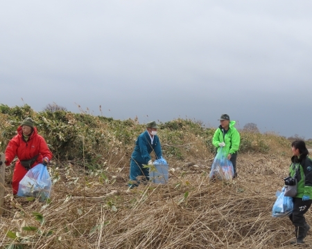 海風が強く吹く青空の元、足元のハマナスのトゲに気を付けながらごみを回収していきます。